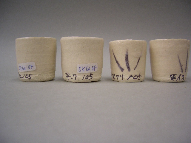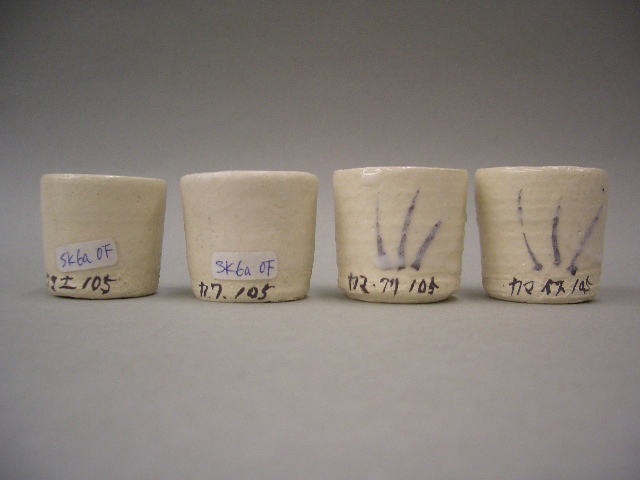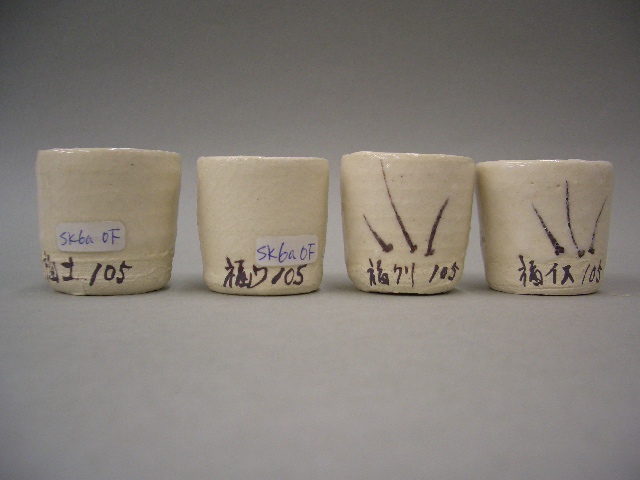 平津長石と合成灰のテストです。 左から、 合成土灰・合成わら灰 合成栗皮灰・合成柞灰 100:5(重量比) |