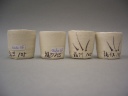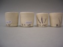 釜戸長石と合成灰のテストです。 左から、 合成土灰・合成わら灰 合成栗皮灰・合成柞灰 100:5(重量比) |